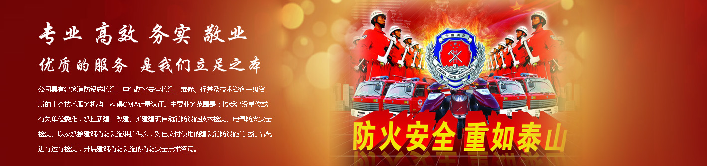 公司具有建筑消防設施檢測、電氣防火安全檢測、維修、保養(yǎng)及技術咨詢一級資質的中介技術服務機構,獲得CMA計量認證。主要業務范圍是:接受建設單位或有關單位委托,承擔新建、改建、擴建建筑自動消防設施技術檢測、電氣防火安全檢測、以及承接建筑消防設施維護保養(yǎng),對已交付使用的建設消防設施的運行情況進行運行檢測,開展建筑消防設施的消防安全技術咨詢。公司設辦公室、總工辦、財務部、檢測部、維保部等職能機構,擁有一